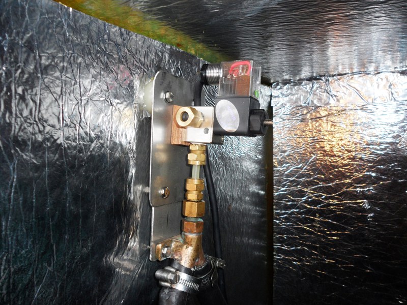 så man skal huske at tømme flasken, som slangen er ført til, eller hvis den ikke drypper, tror den ikke virker. Som forsøg har jeg monteret en solenoideventil, styret fra kontrolpanelet ( grøn ), så ventilen lukker når motoren startes. Ventilen er købt på ebay for lidt under 60 kr. Er der nogen, der har erfaring med en sådan installation.