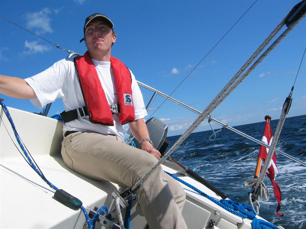 Efter et bad og et godt morgenmåltid (som næsten alt andet sponsoreret af klubben) drog vi næste formiddag atter hjemad. Vinden var løjet noget af og bød på næsten Californisk solskins-sejlads sydpå. Vinden var stadig i vest og da vi skulle ind i Køge bugt måtte vi krydse lidt på det sidste stykke. Det gjorde ikke det store for vinden tog lidt til sidst på dagen, så vi kom godt i havn lidt over 4.
