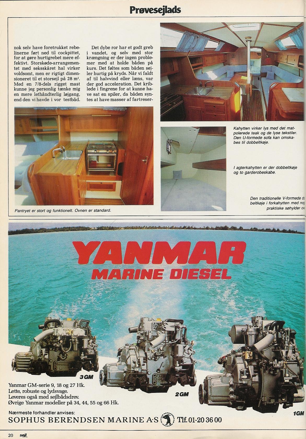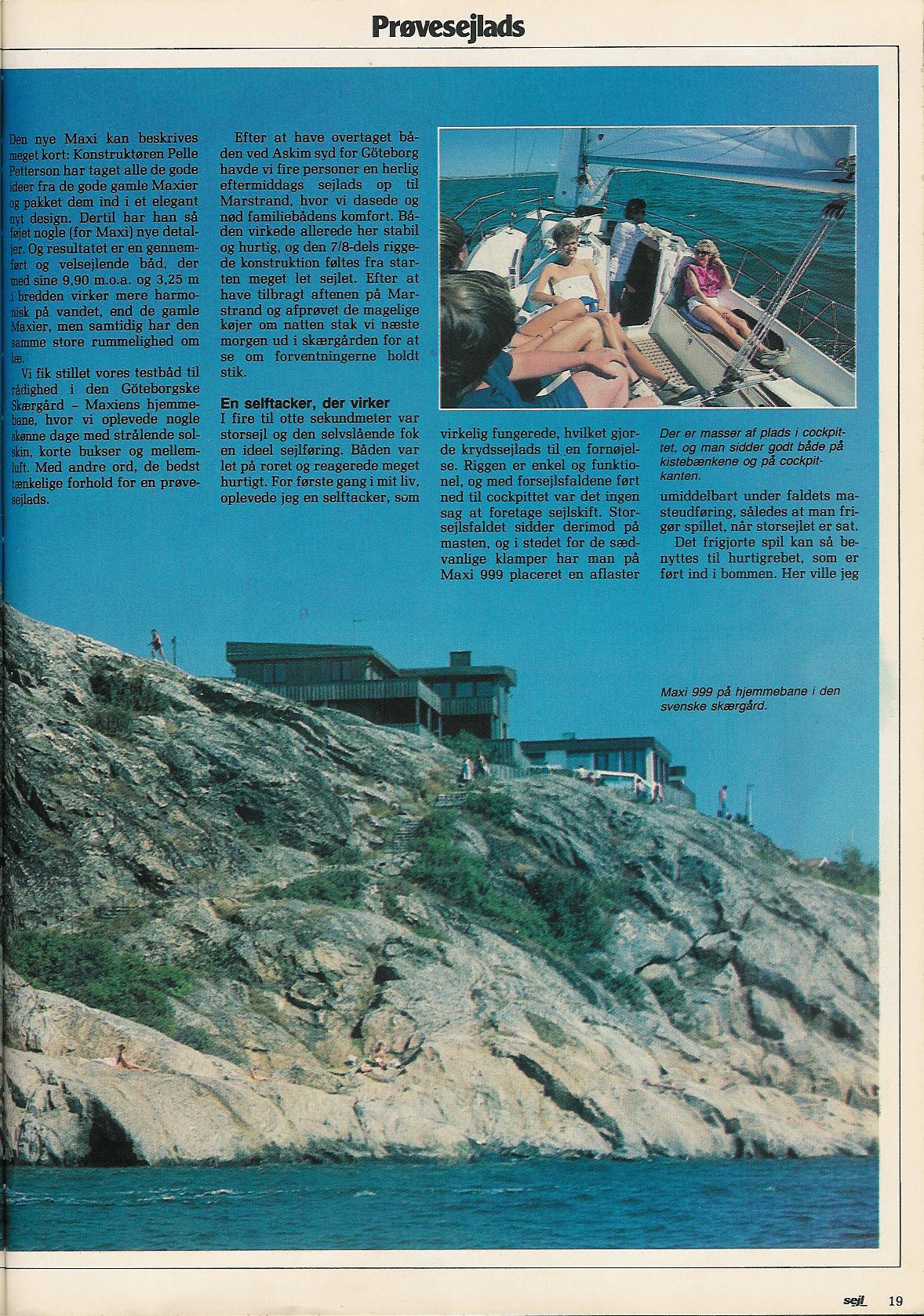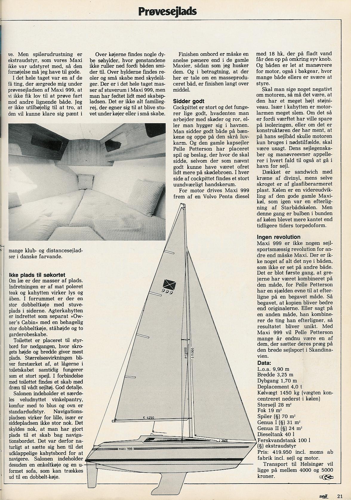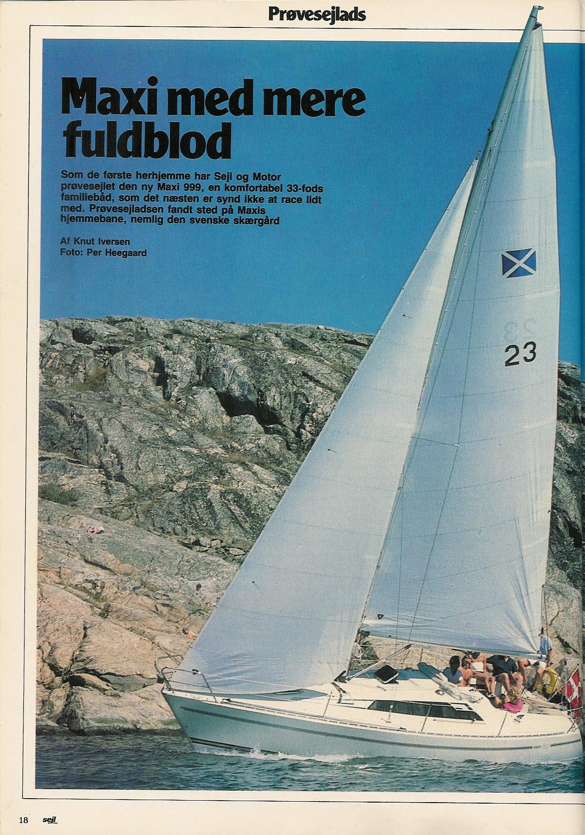 'Sejl og Motor' bragte i Oktober 1985 en test af Maxi 999 under overskriften 'Maxi med mere fuldblod'Bemærk at fotoet af pantry på den tredie side er spejlvendt. 999 har altid pantry i bagbord side.