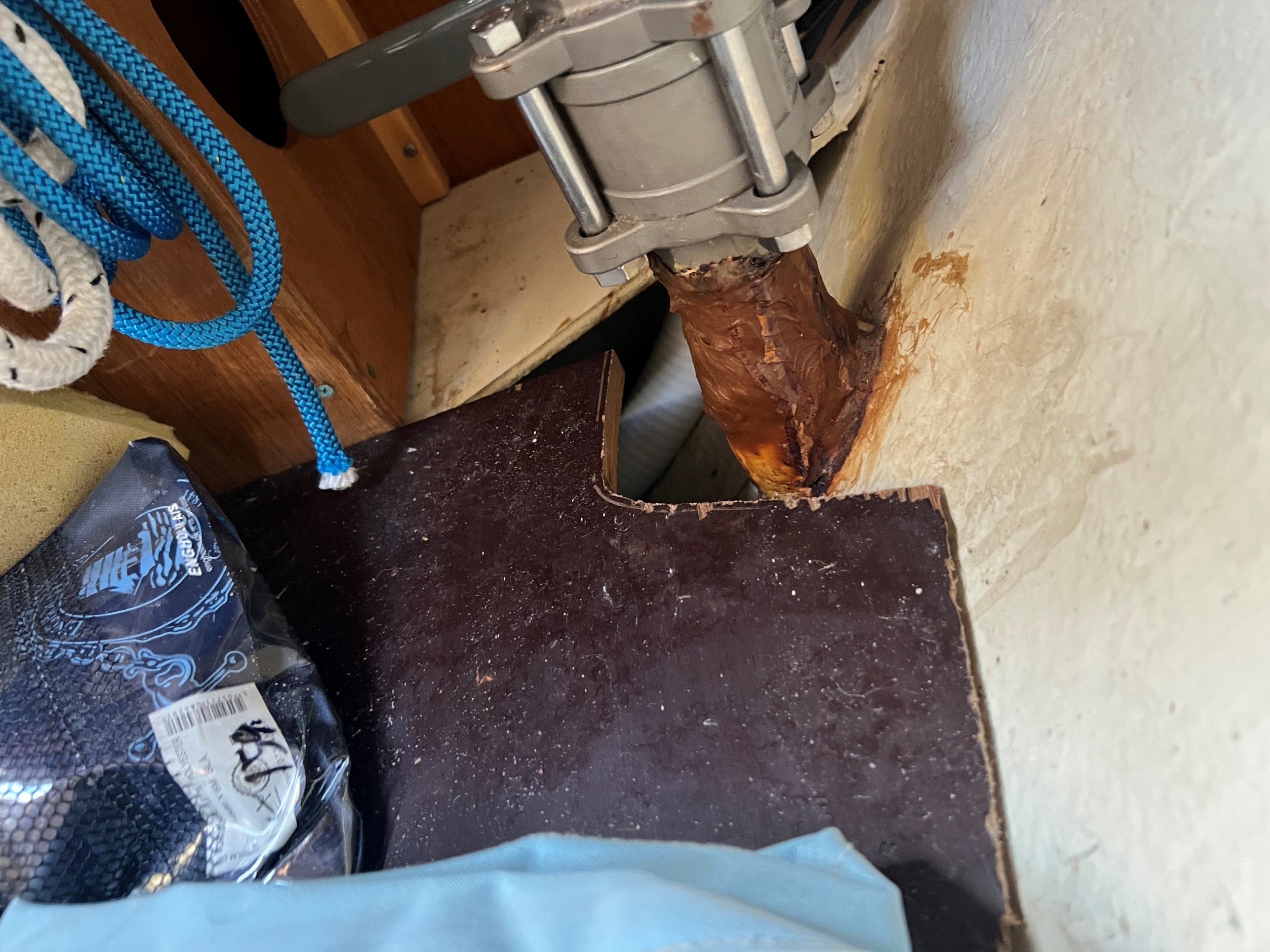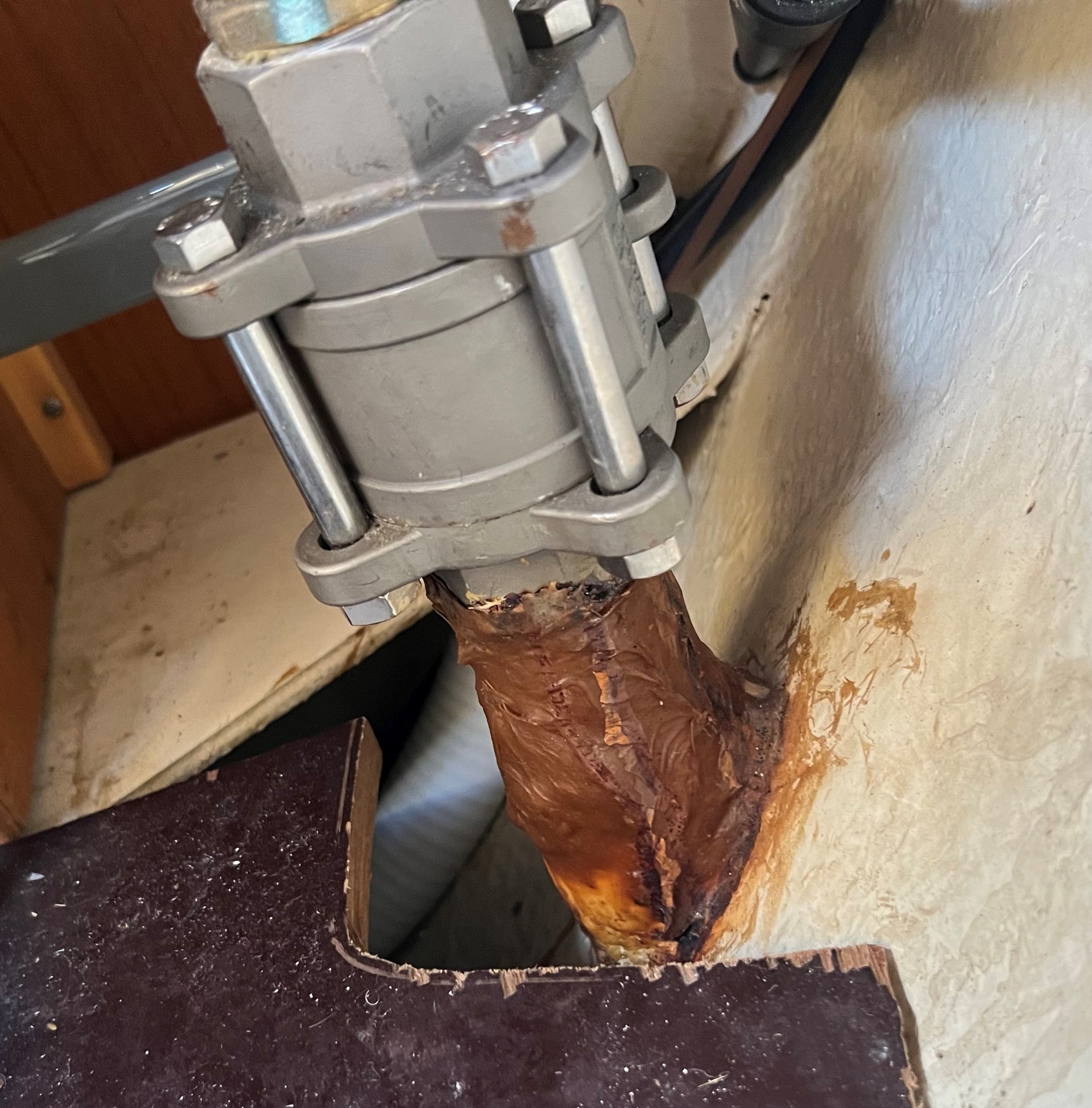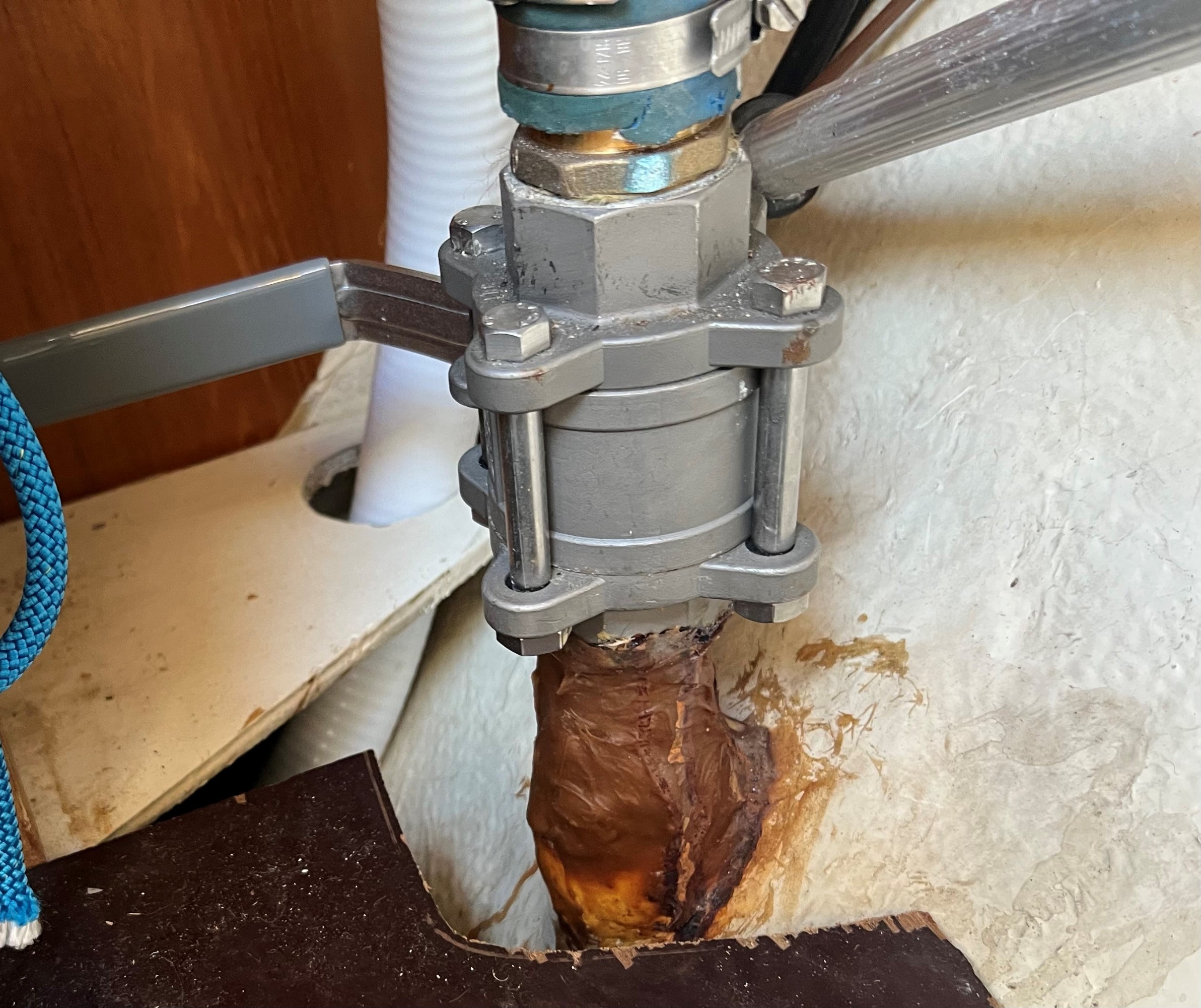 Er dette normalt udseende indstøbt skroggennemføring fra toilettanken på en maxi 909 eller skal dette udskiftes ?