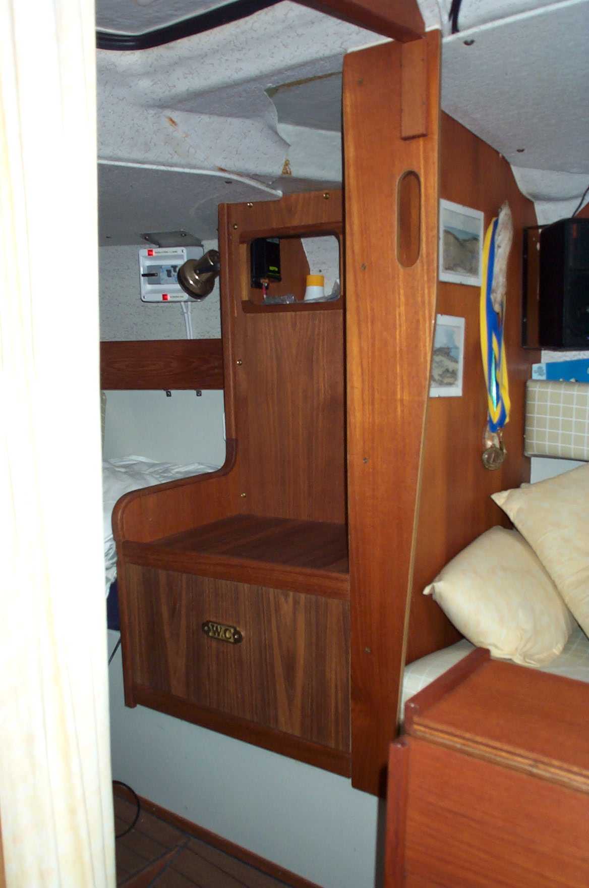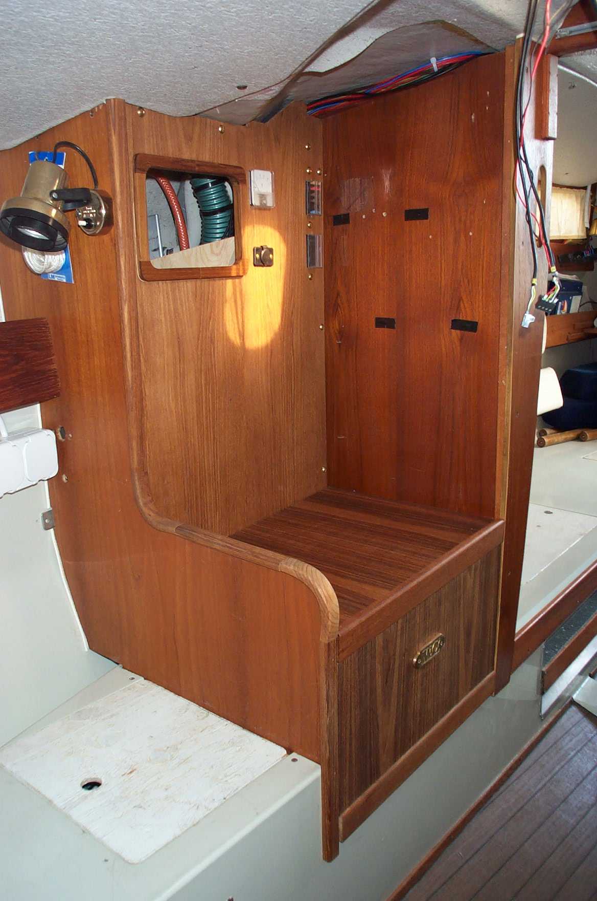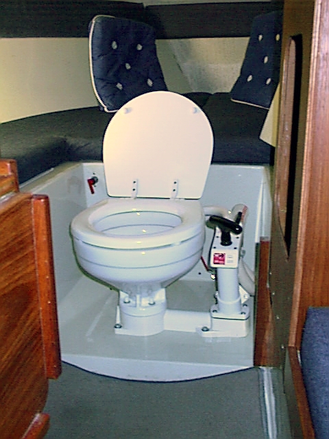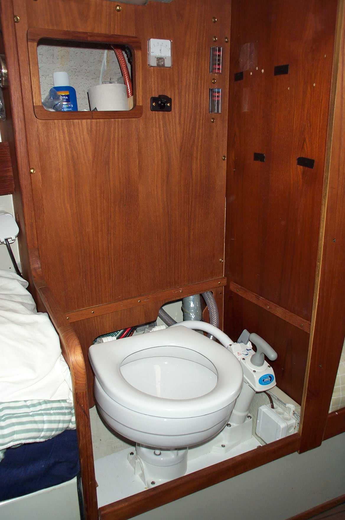 Jag har placerat toaletten i garderoben på styrbordssidan. Septiktanken är placerad bakom toalettstolen mot skrovet ovanför vattenlinjen, enkelt vid tömning. Bredvid tanken finns alla slangar och dessutom alla elkopplingar, allt döljs av ett skott. Ovanför septiktanken blev plats över för ett litet stuvfack.