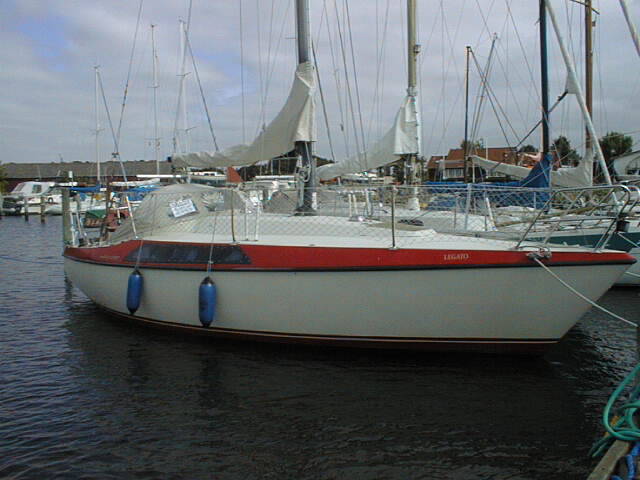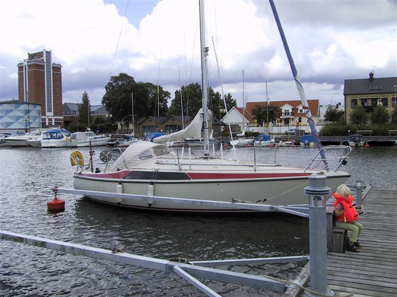 Faktisk er striben heller ikke malet på. Hvis den er malet på din, så er det noget en af de forrige ejere har gjort. Prøv at se godt efter, for det er svært at se forskellen, men fra start var det faktisk gelcoaten der var indfarvet men i 1978 (ca) skiftede man til at sætte en stykke selvklæbende farvet folie på flushkanten. Som det ses på billederne gør det en væsentlig designmæssig forskel. Det er selvfølgelig en smagssag, men jeg synes det "letter" lidt på bådens design og får den til at se lidt mere elegangt ud.