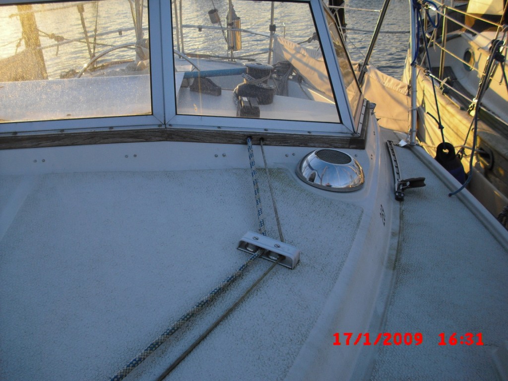 Umiddelbart så vil jeg gerne have storsejlsfaldet og mit bomnedhal med tilbage..En kollega har foreslået at sætte vindspejlet på en ca. 2 cm teakliste hele vejen rundt og bore huller til faldene, men så mener jeg, at der opstår komplikationer med spayhood og cockpitteltet, når det skal monteres.