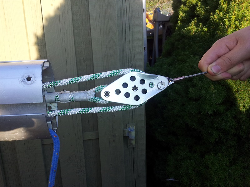 På min Fenix er der et efterhånden meget gammelt wire/fald som bomudhal, som er ført til cockpit. Dette vil jeg udskifte til et dynema-fald.