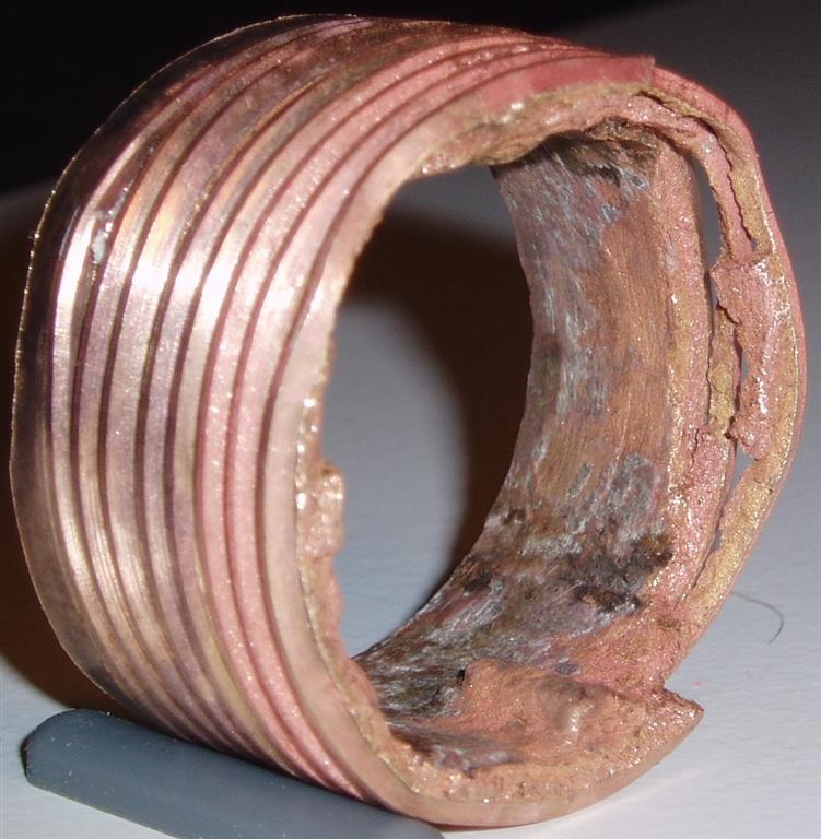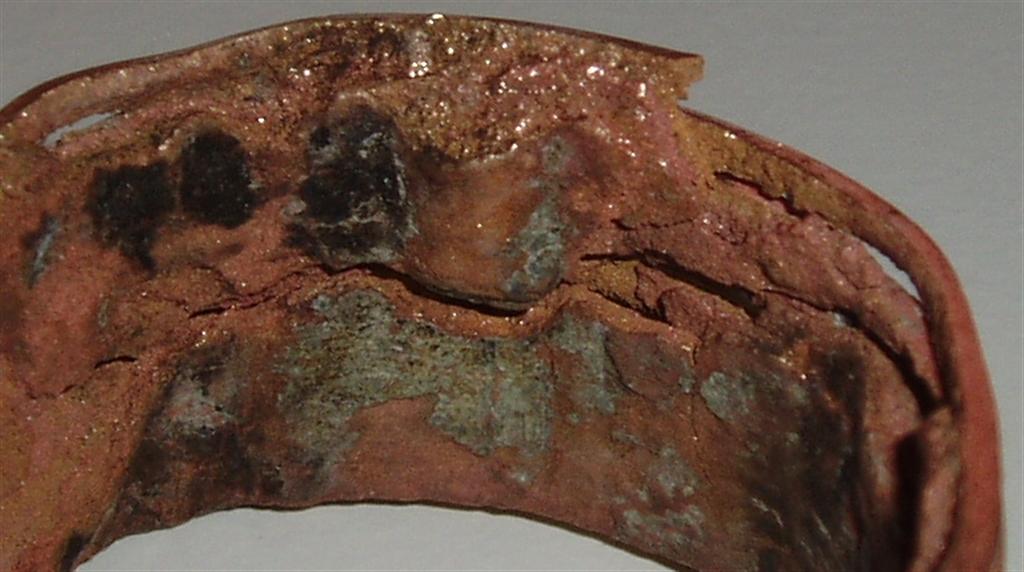 1) Afzinkning, hvor brudfladerne udviser RØD, PORØS messing 2) Spændingskorrosion (Mekanisk spænding !) i høj grad lokaliseret til området som møtrikken på gennemføringen har dækket. Det område som er dækket af skroget er kun svagt påvirket ligesom den udenbords flange. Flangen er væk da demontering skete ved at en vinkelsliber fjernede flangen så "sættet" kunne trækkes ind i båden.